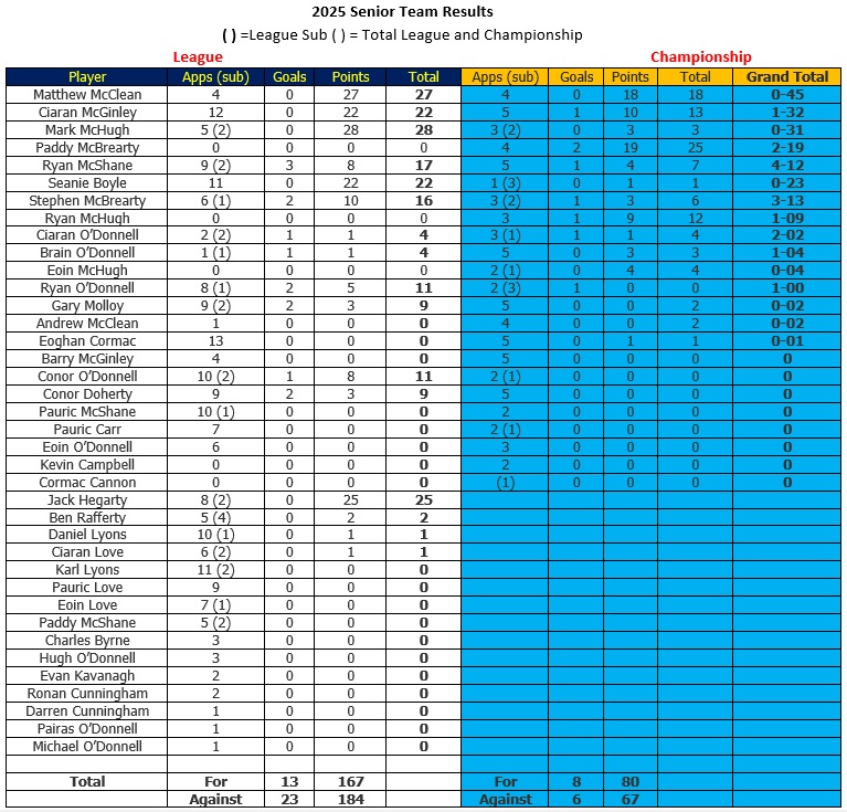 Ciaran O’Donnell, Matthew McClean 0-07, Stephen McBrearty 1-00