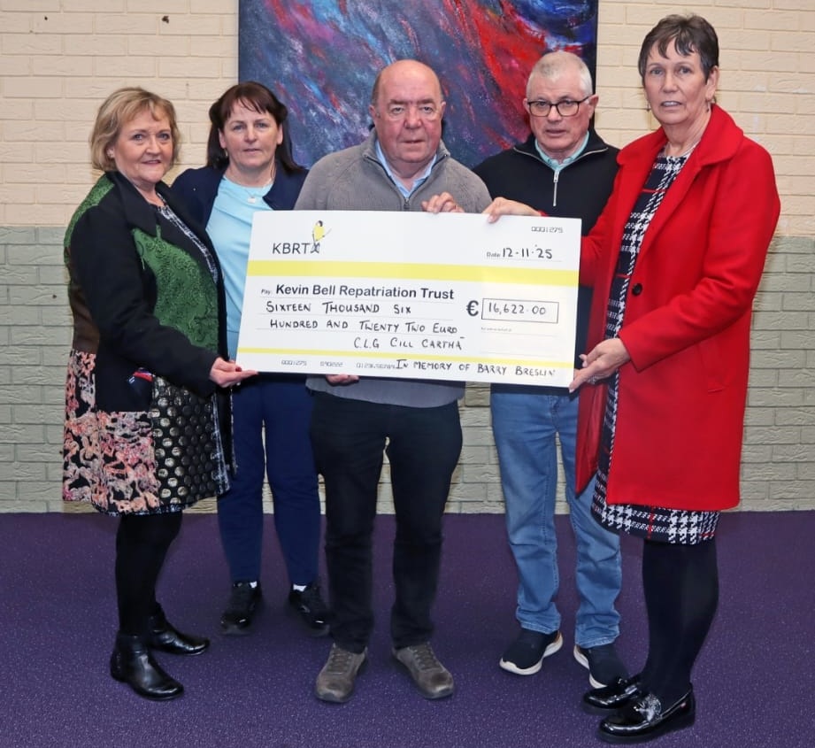 Thug muid lánsuim de €16,622 síntiús don chiste 'Kevin Bell Repatriation fund'. Rinne muid an bronnadh seo i gcuimhne ar Barry Ó Breasláin as Srath Laoill, Cill Chartha, cailleadh é i dtimpiste ina áit oibre i bPerth san Astráil beagnach bliain ó shin.