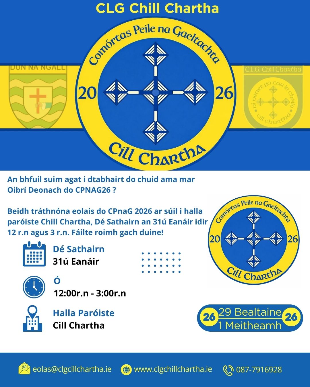 Beidh tráthnóna eolais do CPnaG 2026 ar súil i halla paróiste Chill Chartha, Dé Sathairn an 31ú Eanáir idir 12 r.n agus 3 r.n. Fáilte roimh gach duine!
