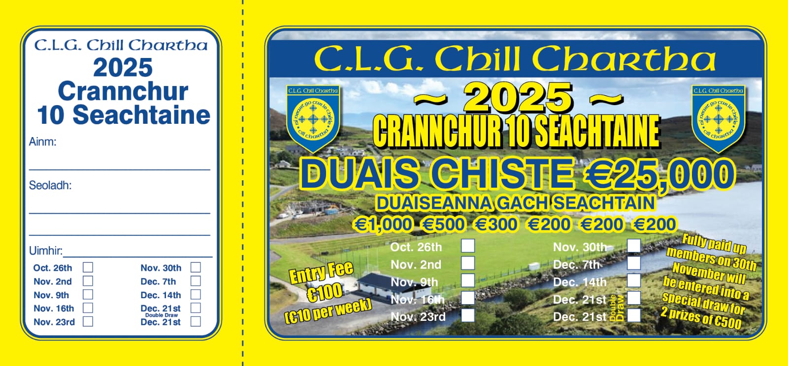 Tosaíonn Crannchur Deich Seachtaine CLG Chill Chartha Dé Domhnaigh an 26 Deireadh Fómhair agus beidh na tarraingtí ar siúl ag bingo an chlub i John Joes.